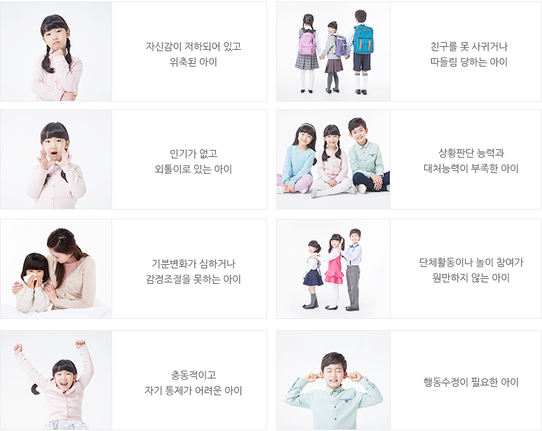 사회성 기술의 습득을 통하여 의사소통기술이나 자기표현방법, 또는 또래와 어울리기 및 학업기술 등을 향상시키도록 돕습니다.